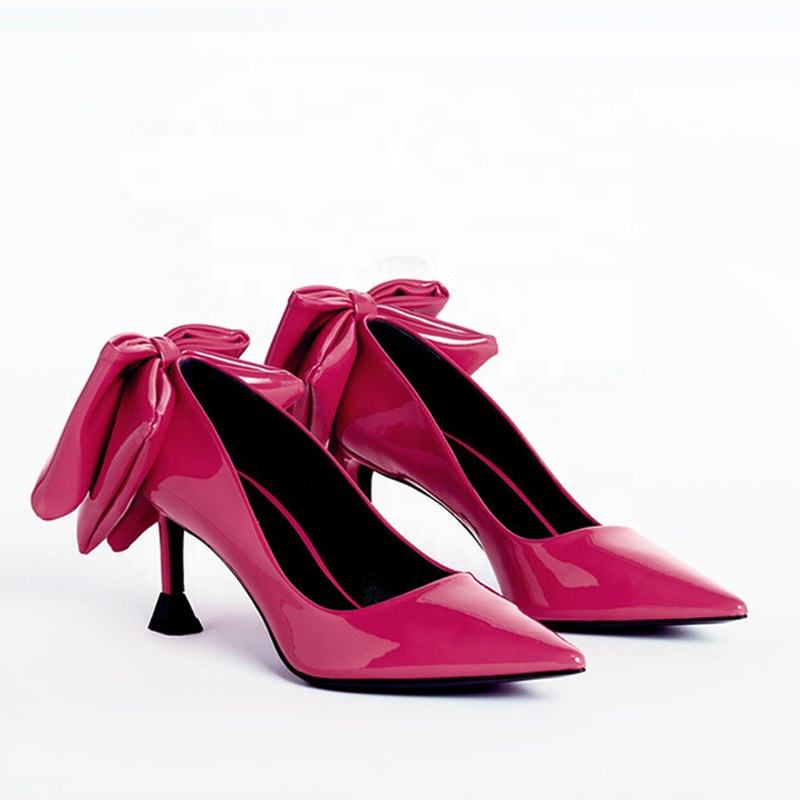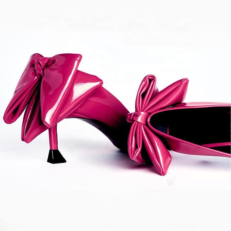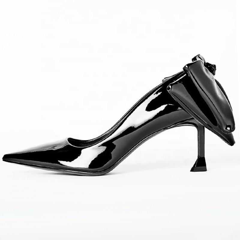 Escarpins de soirée pour femme en cuir verni brillant, à talon aiguille haut et fin, avec grand nœud arrière, style bureau
