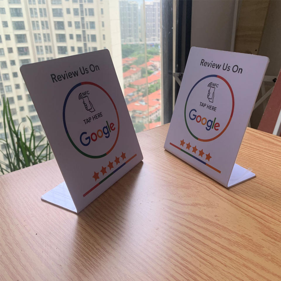 Grande taille 13.56Mhz programmable NFC Google Review présentoir personnalisé imprimé PVC NFC robinet pour examiner le support de Page pour Restaurant