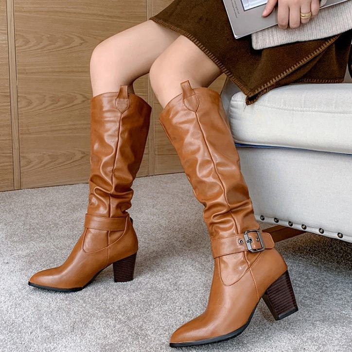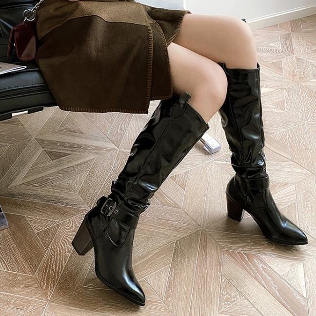 Bottes longues pour femmes à talon épais et bout pointu, taille 46, avec boucle à la cheville, à enfiler