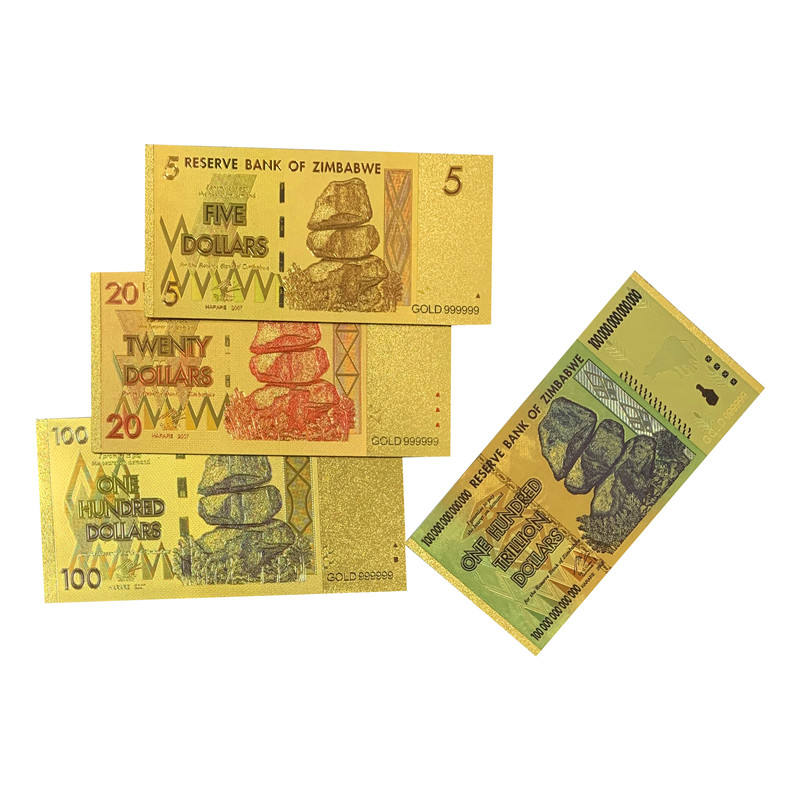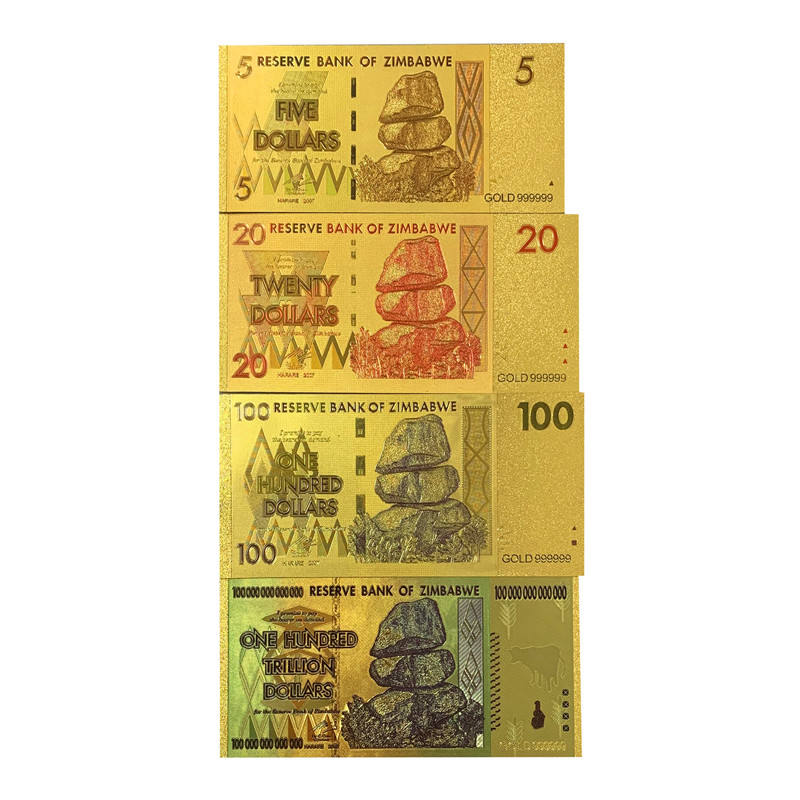 Bill of Zimbabwe Dollar 24 K Vivid Gold Foil Banknote for Collection 4 Pieces