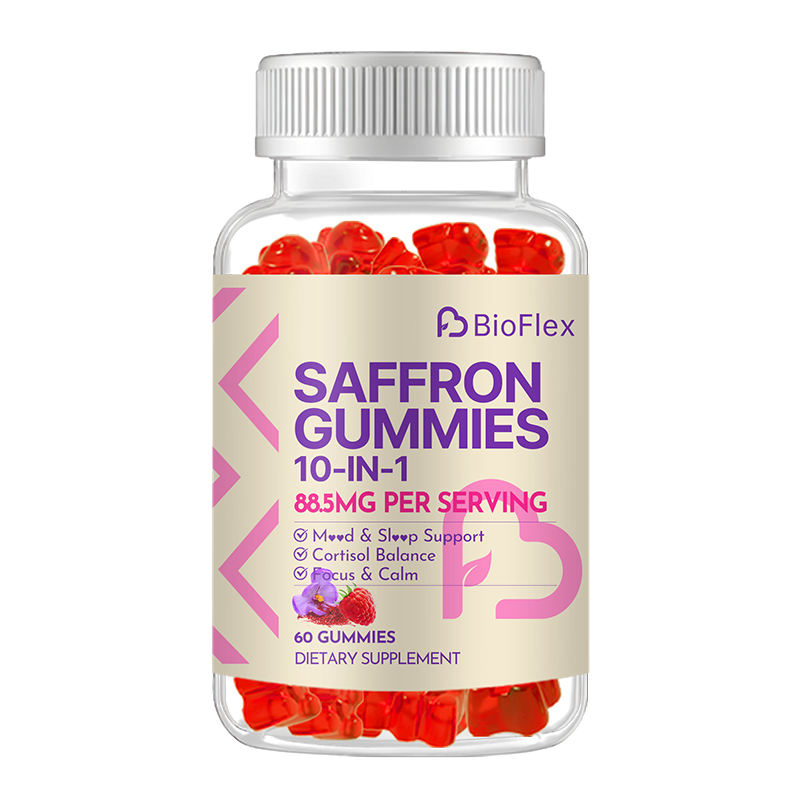 BioFlex Gummies à la saveur naturelle de framboise, formule biologique 10 en 1, anti-stress, extrait de safran et d'ashwagandha, compléments alimentaires pour l'humeur