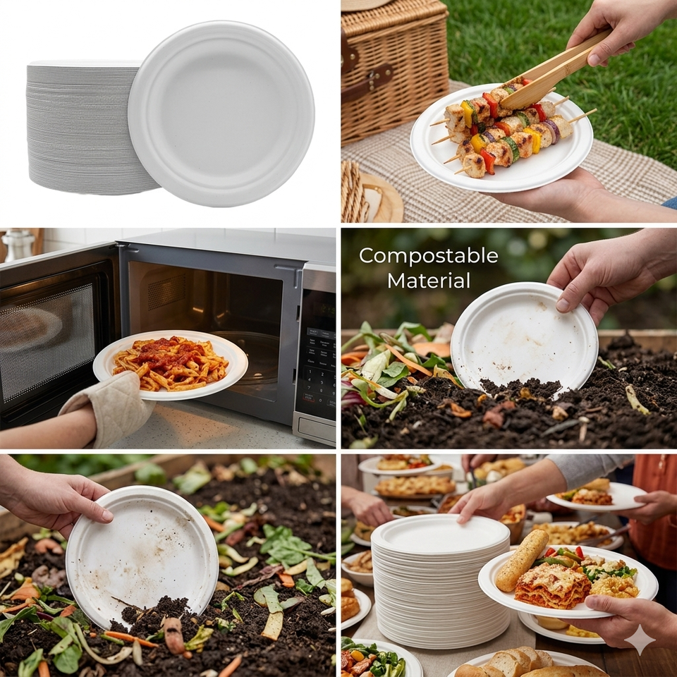 Assiettes biodégradables et compostables en pulpe de canne à sucre de 6 pouces, assiettes jetables en bagasse, robustes, compatibles micro-ondes, écologiques