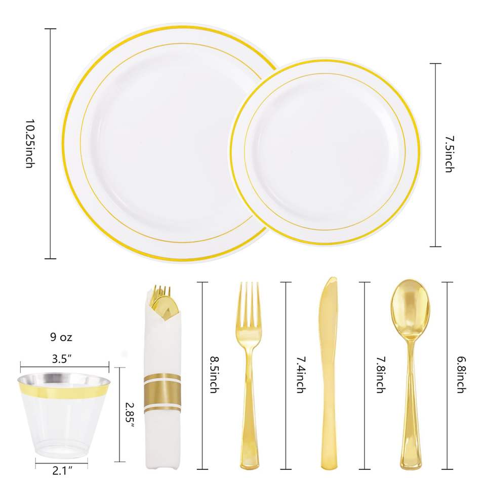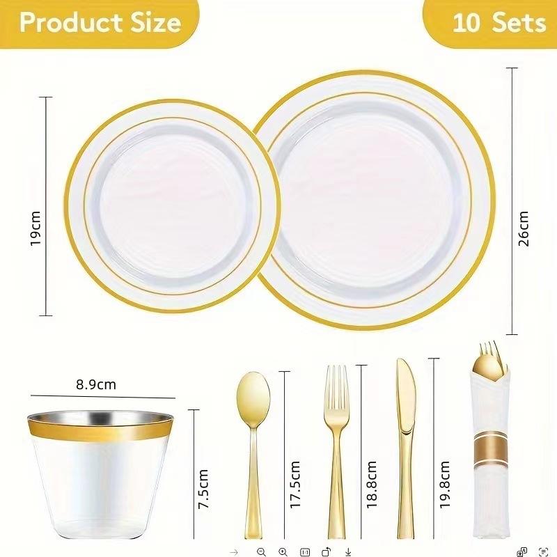 Assiettes en plastique biodégradable dorées, ensemble de couverts jetables (pour 10 invités)