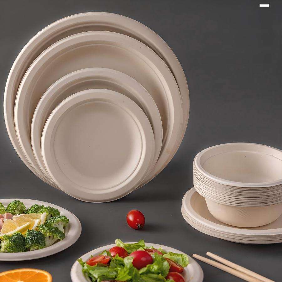 Assiettes biodégradables en canne à sucre, assiettes compostables en bagasse, couteaux, fourchettes, cuillères, assiettes, serviettes, bols, tasses personnalisés – Ensemble complet