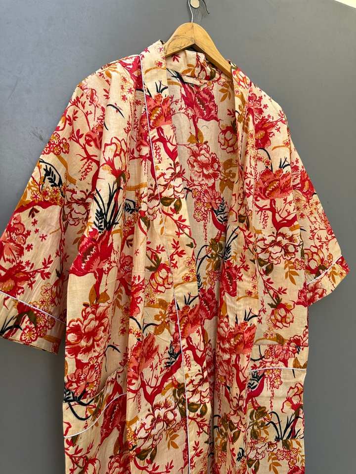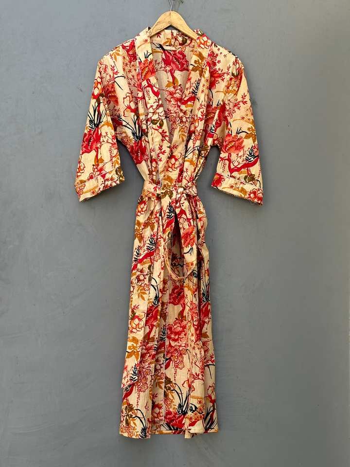 Robe kimono en coton imprimé à motif d'oiseaux, col en V, faite à la main, imprimée, style bohème, vêtements de détente, été, printemps, séchage rapide, manches longues