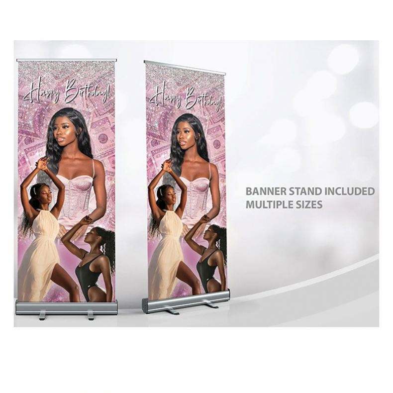 Bannière d'anniversaire rétractable rose pour décoration d'anniversaire, support de bannière enroulable, panneau de bienvenue pour anniversaire