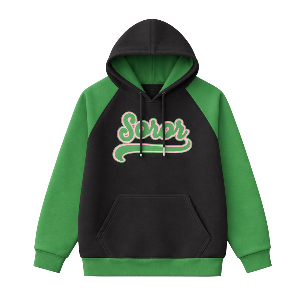 Sweat à capuche à manches raglan noir 08 Soror, sororité grecque, femmes, rose et vert, sororité universitaire, sweat à capuche décontracté élégant, vêtements