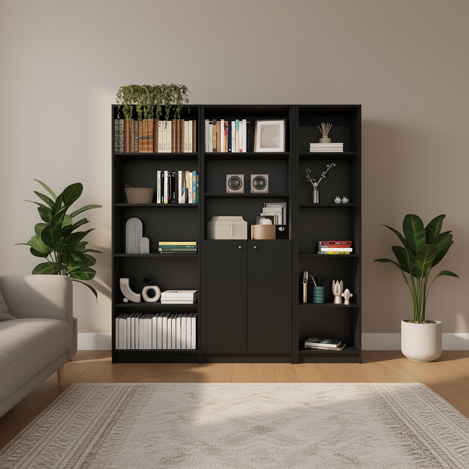 Black 3 Piece Bookcase Set Modern Minimalist Design Living Room Furniture MDF Wood Shelf Cubby Storage Home Decor