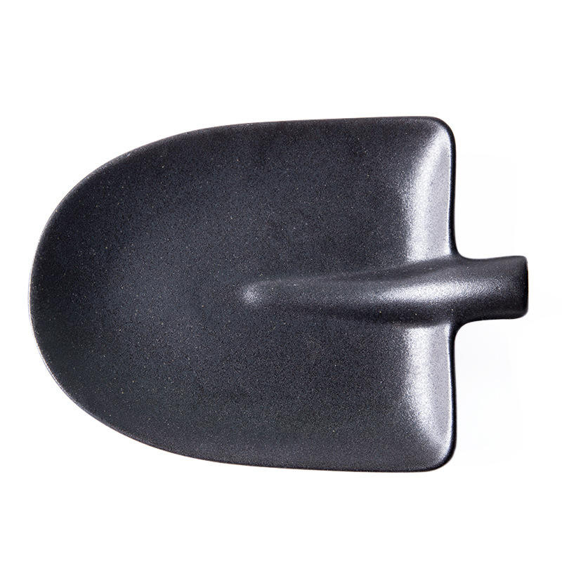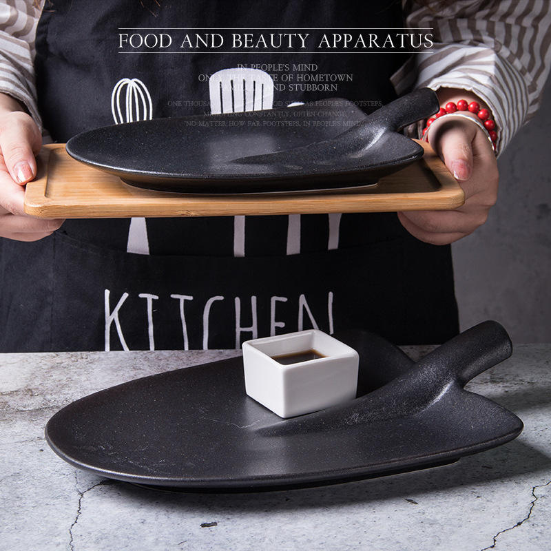 Assiette plate en céramique noire abstraite givrée en forme de pelle pour snacks de steak, idéale pour hôtels et restaurants