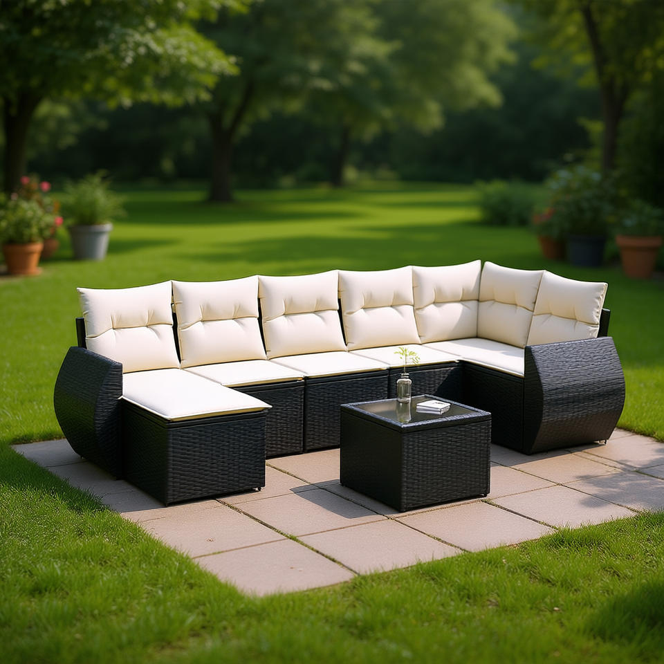Ensemble de canapés de jardin en rotin noir et crème, structure en acier thermolaqué, mobilier d'extérieur élégant pour usage en jardin