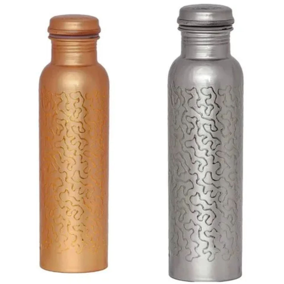 Bouteilles à boisson en cuivre de qualité supérieure, fabriquées en Inde, de couleur noire et dorée, au design unique et attrayant.