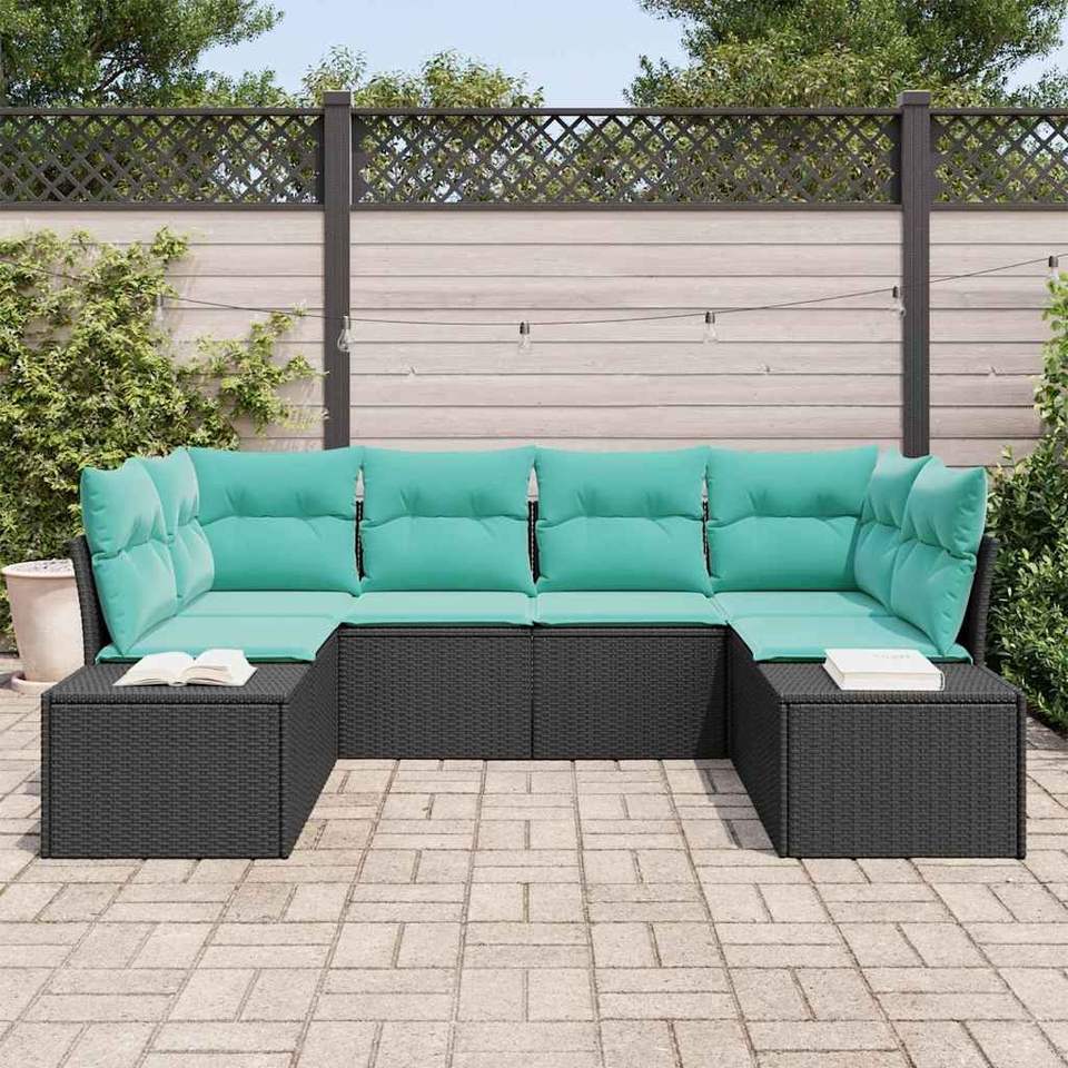 Ensemble de canapés de jardin en polyrotin noir et turquoise avec coussins en mousse haute densité, meubles d'extérieur imperméables au design contemporain