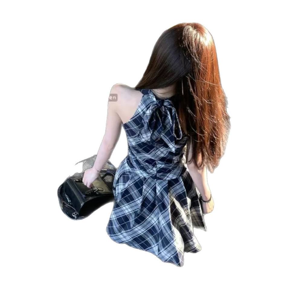 Robe Halter Col V à Carreaux Noirs et Blancs pour Femme Printemps/Été 2025 Coupe Slim Évasée à Nouer Décontractée Quotidienne Respirante Numérique