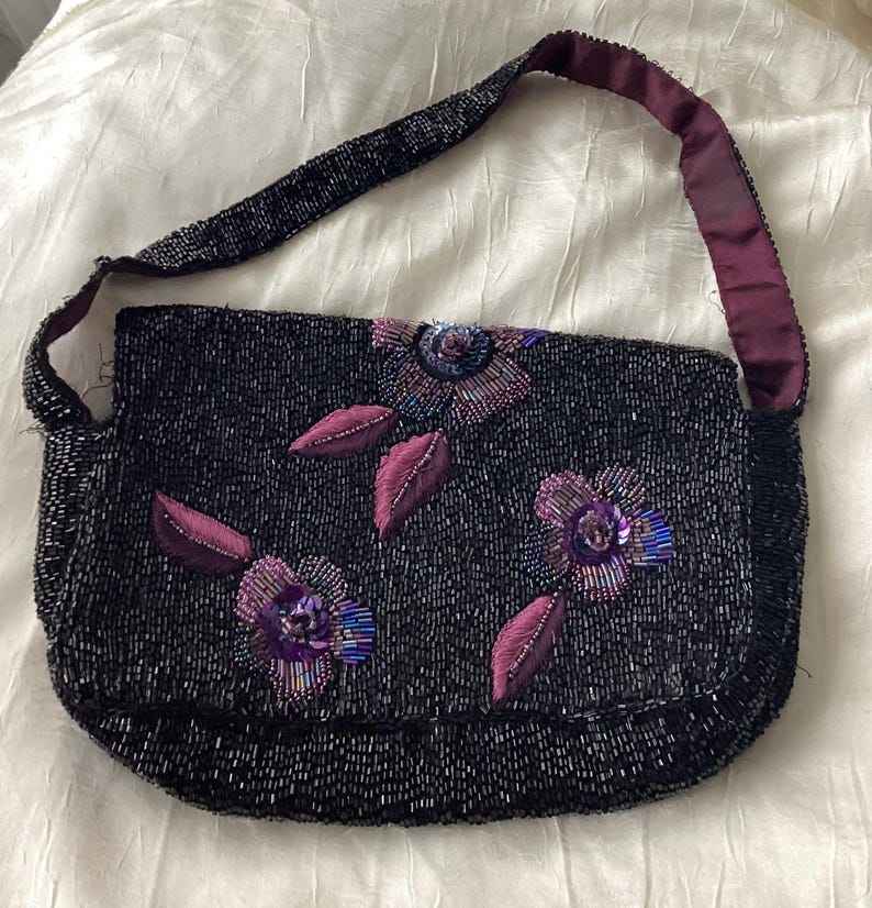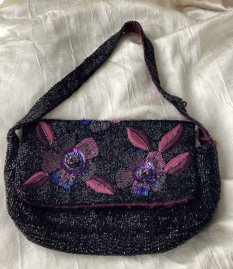 Black Beaded Shoulder Evening Bag with Beaded Floral Design