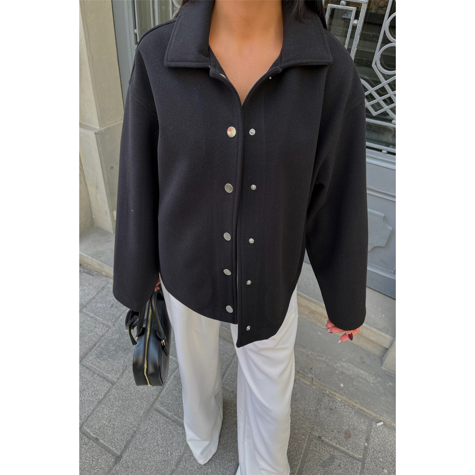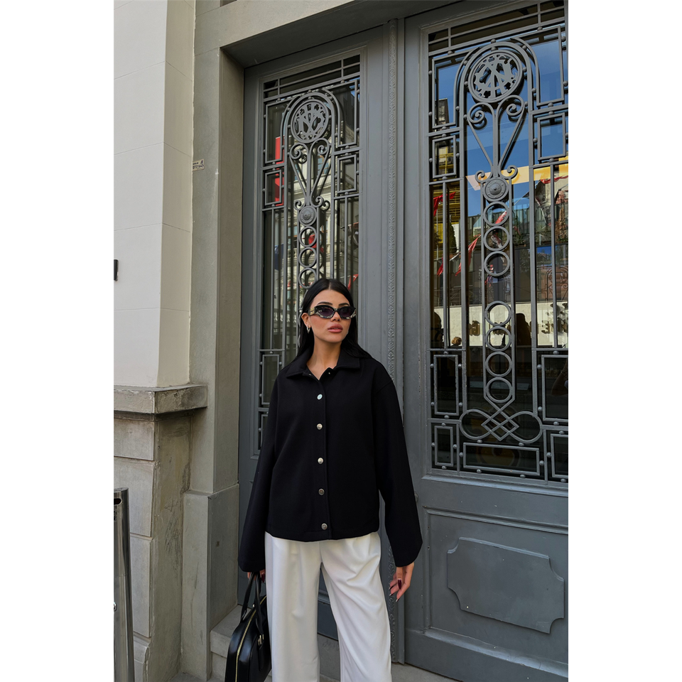 Black Cashmere Woolen Coat with Side Pockets Long Length Warm with Sheep Fur Decoration Belt Closure Button Leather Material