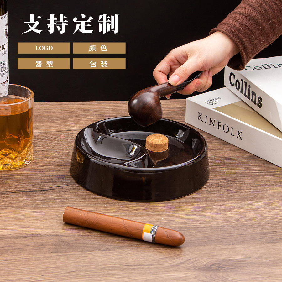 Cendrier rond en céramique noire pour pipe et cigarette avec bouchon en liège, idéal pour la maison ou comme cadeau