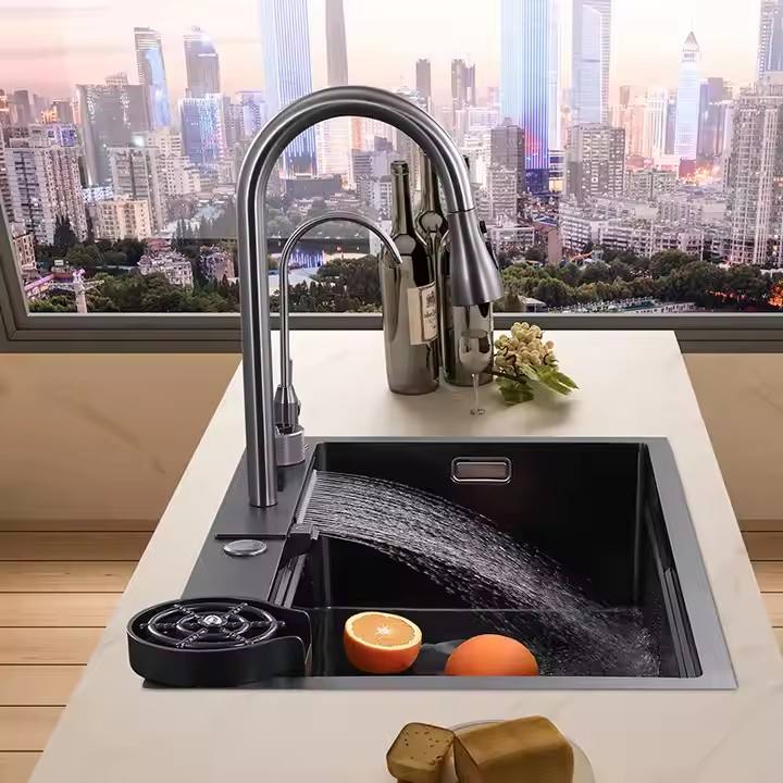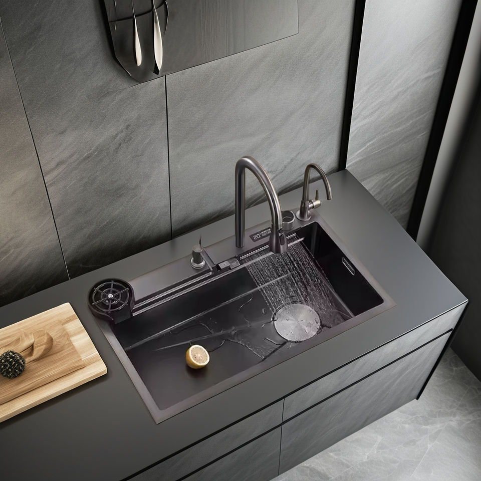 Couleur noire 304 acier inoxydable cuisine affichage numérique raindance cascade tasse laveuse évier de cuisine intelligent pour la maison maison