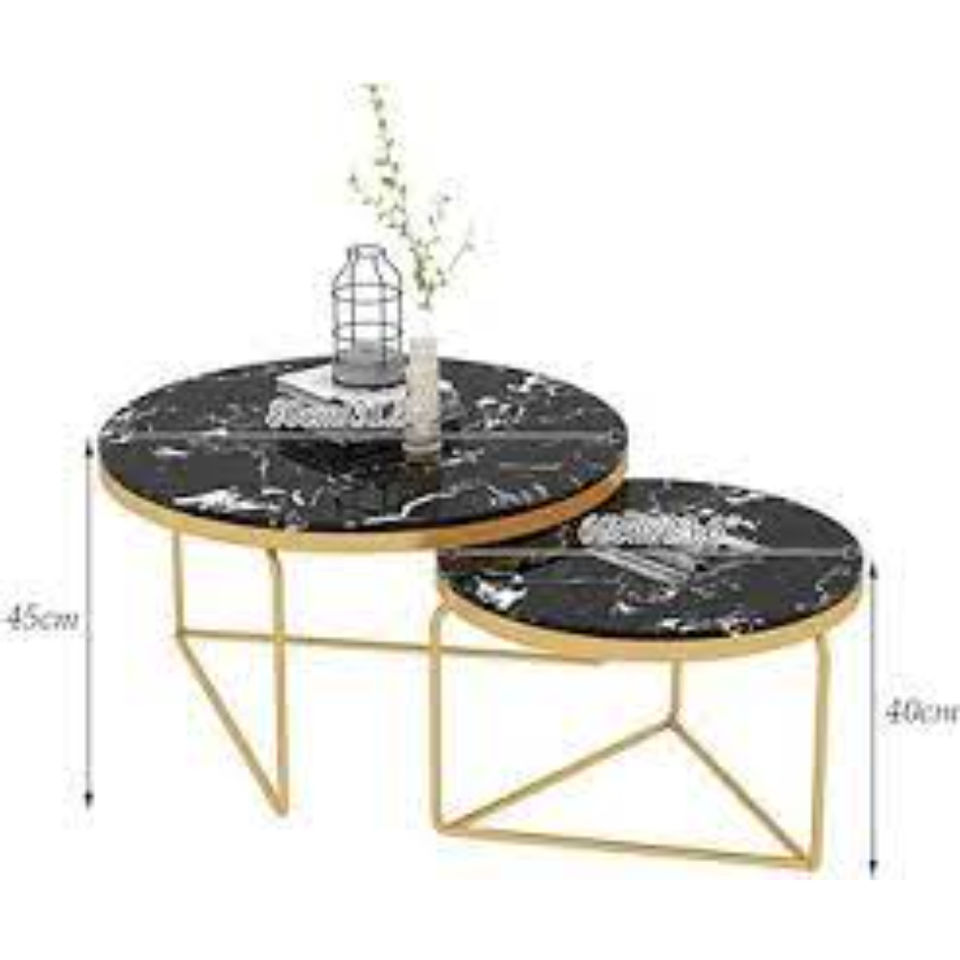 Tables basses gigognes en marbre de couleur noire, au design attrayant et de forme ronde, avec un plateau en marbre et une structure en métal plaqué or de haute qualité.