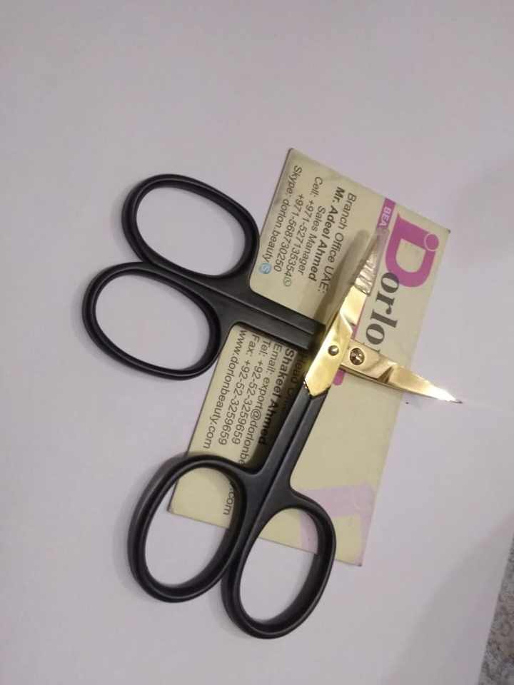 Couleur noire enduite de petits ciseaux à pointe plaquée or Ciseaux à sourcils à lame droite en acier inoxydable Ciseaux à couper les cheveux au Pakistan.