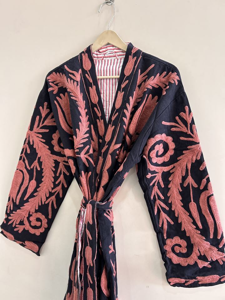 Veste kimono en coton brodé Suzani faite à la main de couleur noire, unisexe, longue