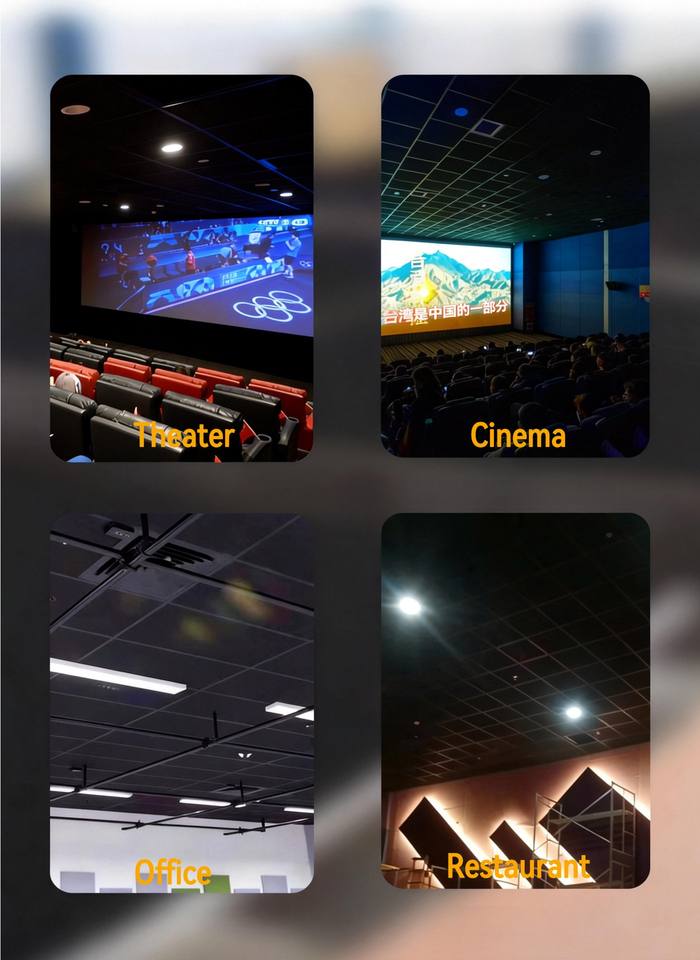 Dalles de plafond en fibre minérale insonorisantes et ignifuges, de couleur noire, de forme carrée et modernes, pour cinéma