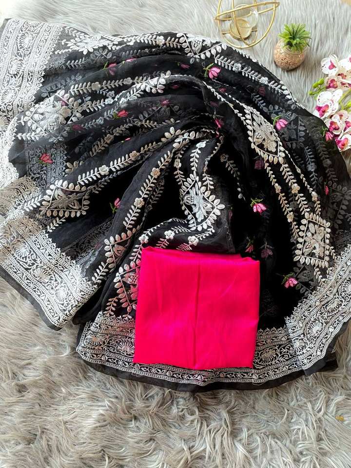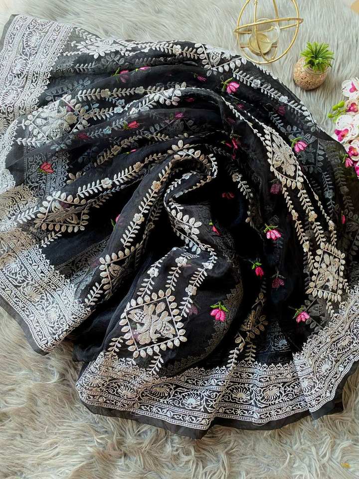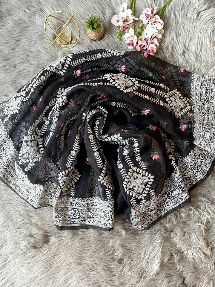 Couleur noire nouveauté Sari en organza pur et doux avec travail Multy Thread et Tussels lourds avec chemisier blanc en soie mariages Saree