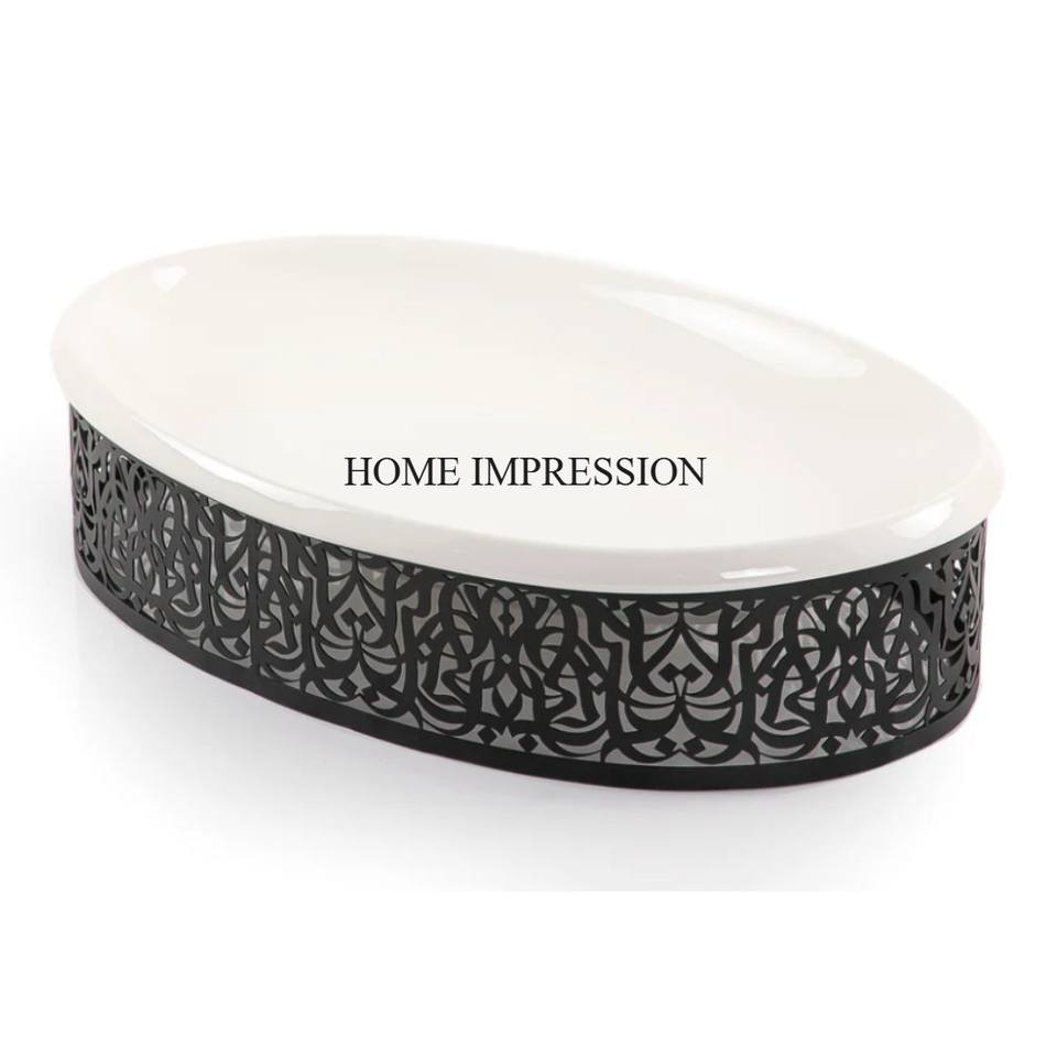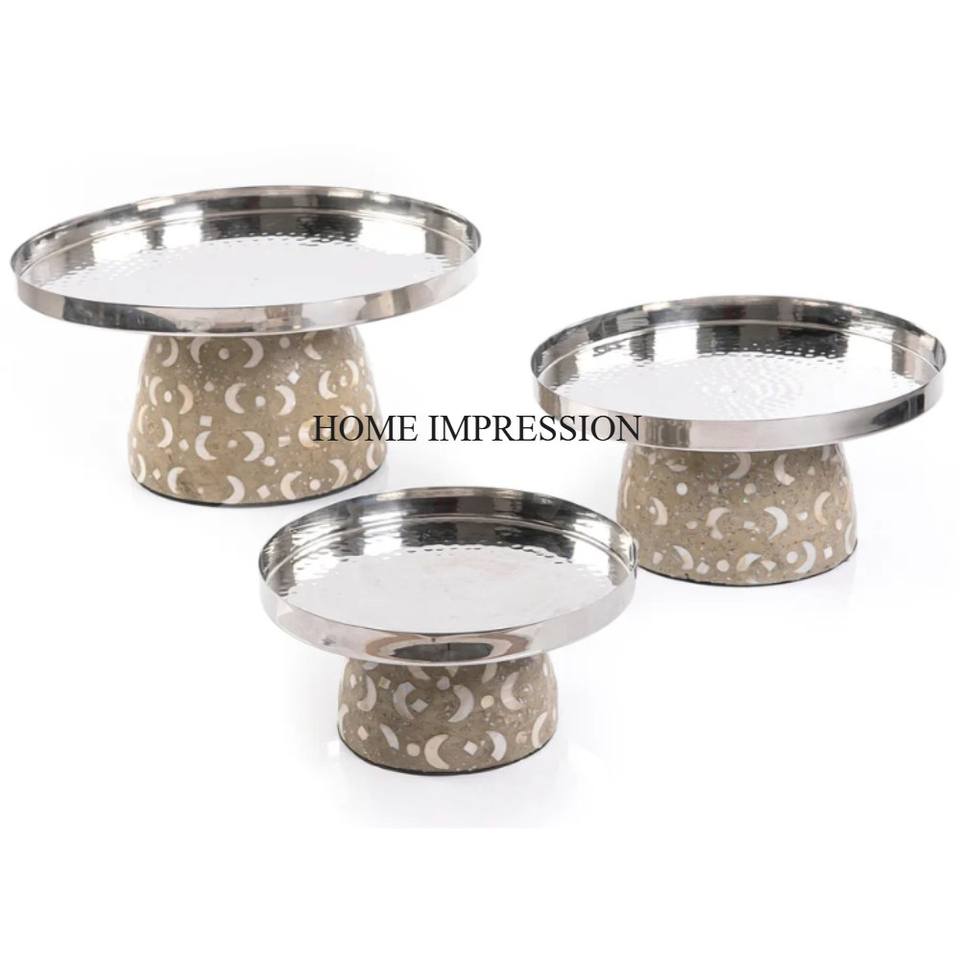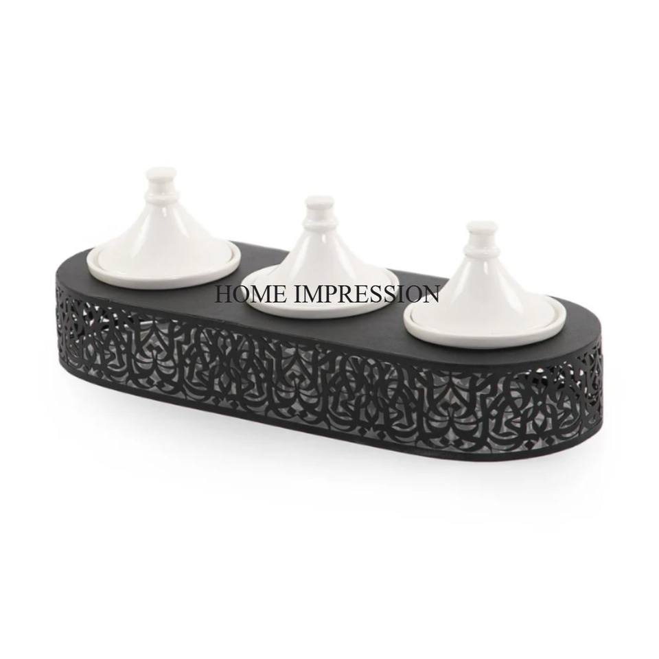 Base de créateur de fantaisie au look attrayant enduit de poudre de couleur noire avec 3 petits aliments en métal de couleur blanche et plateaux de service aux dates