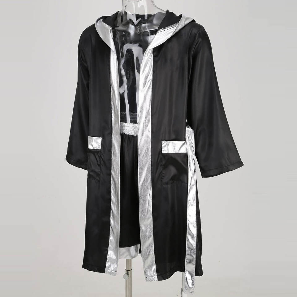Robe de boxe de qualité supérieure, best-seller, couleur noire avec doublure argentée, avec capuche, ceinture argentée, robes de boxe personnalisées, tenue de combat