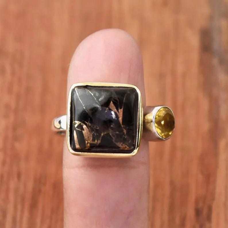 Bague Citrine Turquoise Cuivre Noir Argent Sterling 925 Coussin Réglable Pierres Précieuses Bijoux de Déclaration