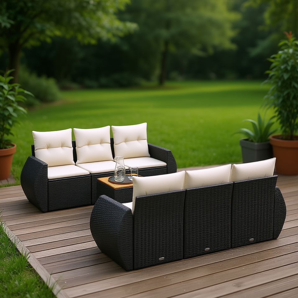 Ensemble de canapés de jardin en rotin noir crème 6 places, mobilier d'extérieur résistant aux intempéries, design contemporain