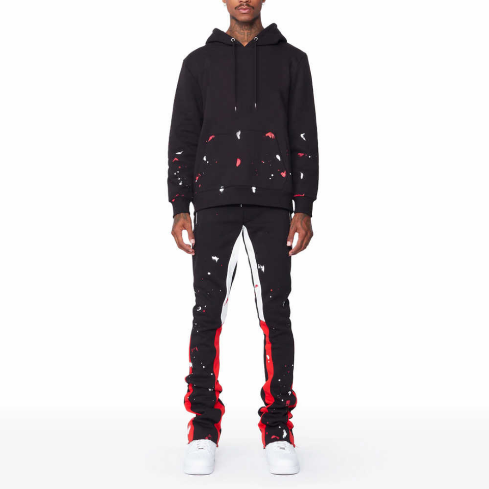 Noir personnalisé bouffée impression polaire évasé survêtements hommes Streetwear à capuche pantalon 100% coton 2 pièces ensemble