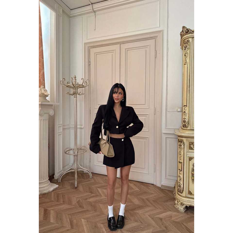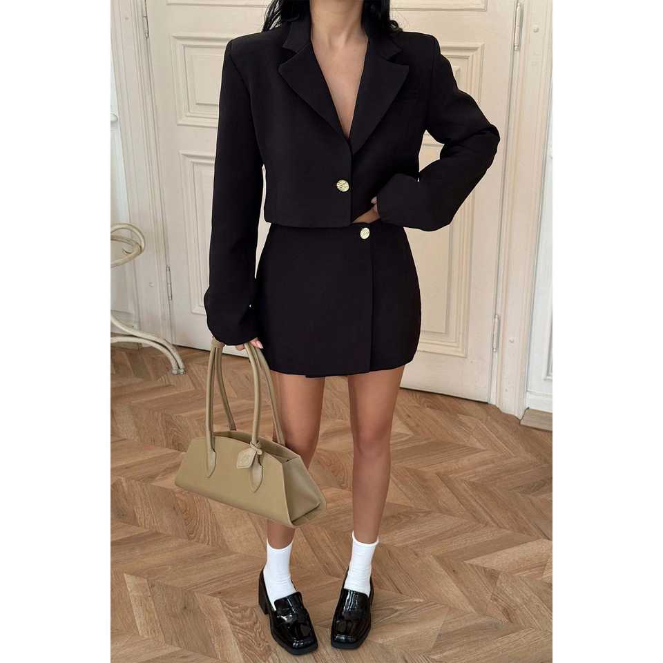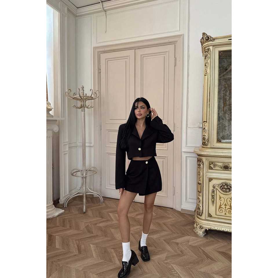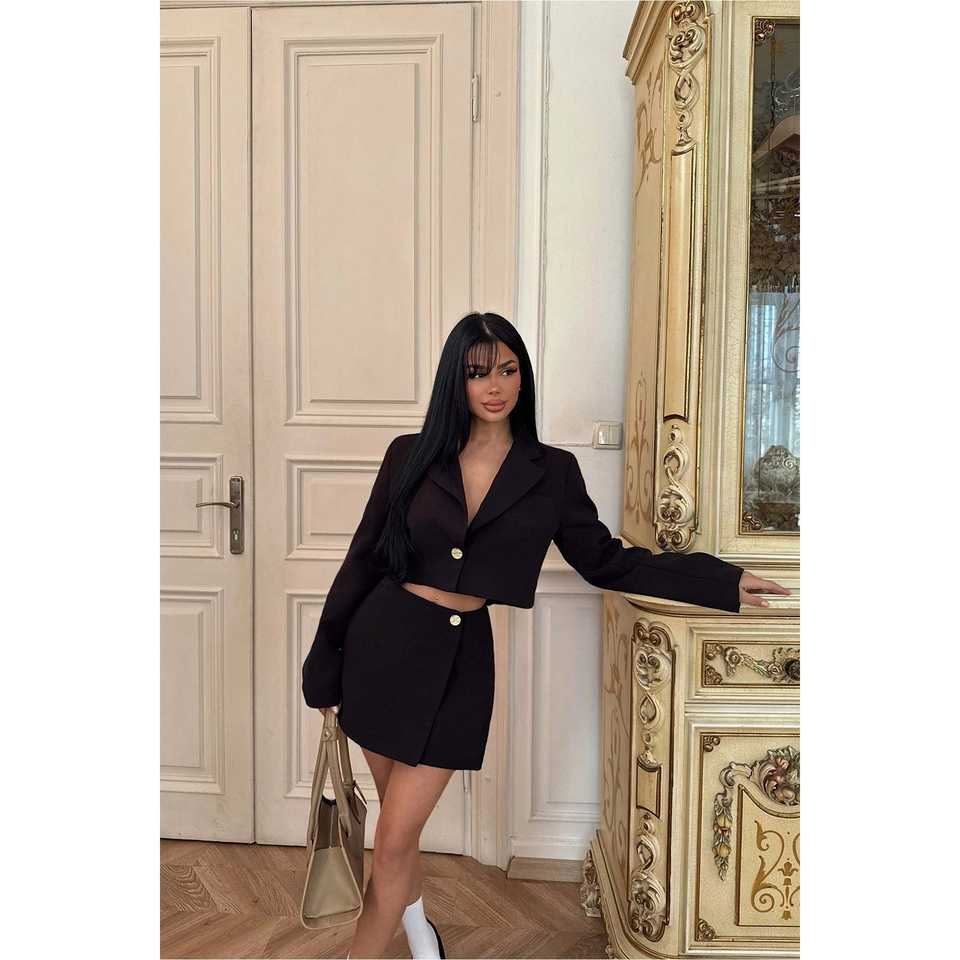 Black Delia Casual Suit with Pleated Decoration and Button Fastening