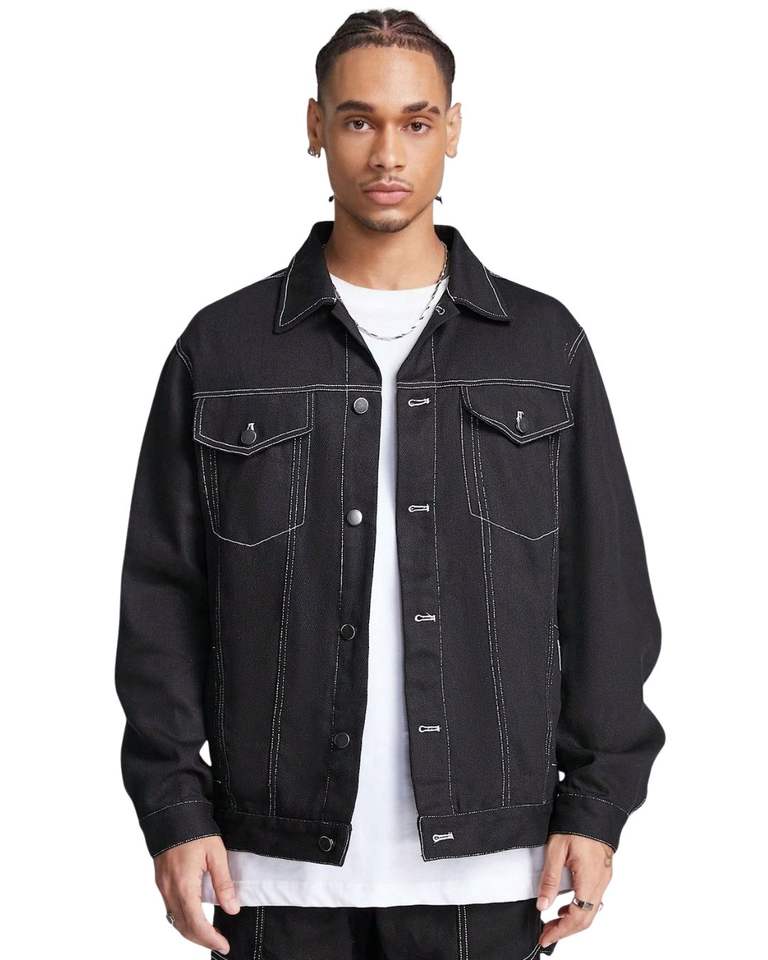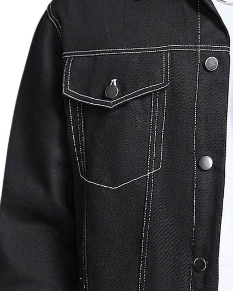 Veste en jean noire pour homme avec surpiqûres contrastées blanches, boutonnée, poches classiques, style streetwear décontracté