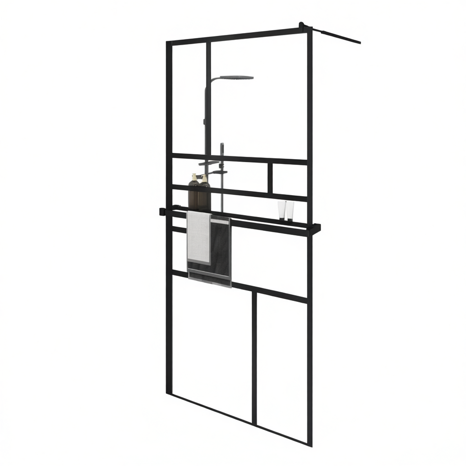 Paroi de douche en verre ESG noir et aluminium avec étagère pour salle de bain, design rectangulaire minimaliste