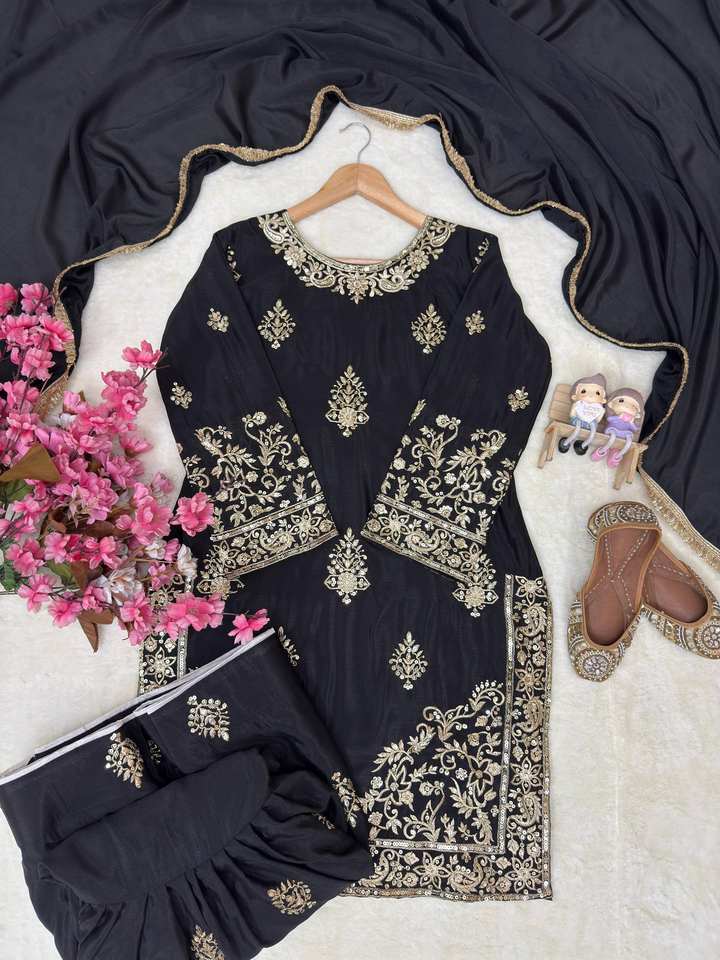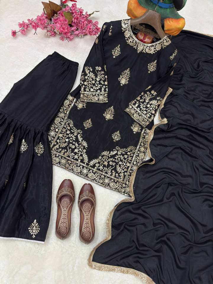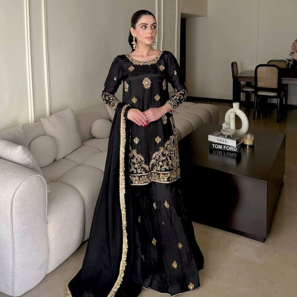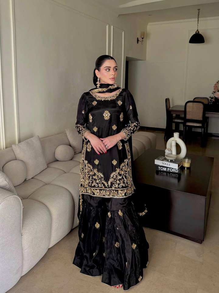 Ensemble Kurti Sharara brodé noir avec dupatta pour femme, tenue de soirée de mariage de créateur, costume ethnique avec travail de sequins Zari