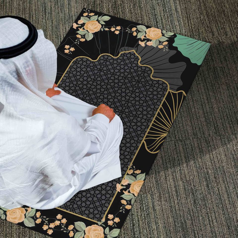 Tapis de prière noir à motifs floraux : tapis de prière islamique musulman, tapis imprimé, tapis fin non tissé