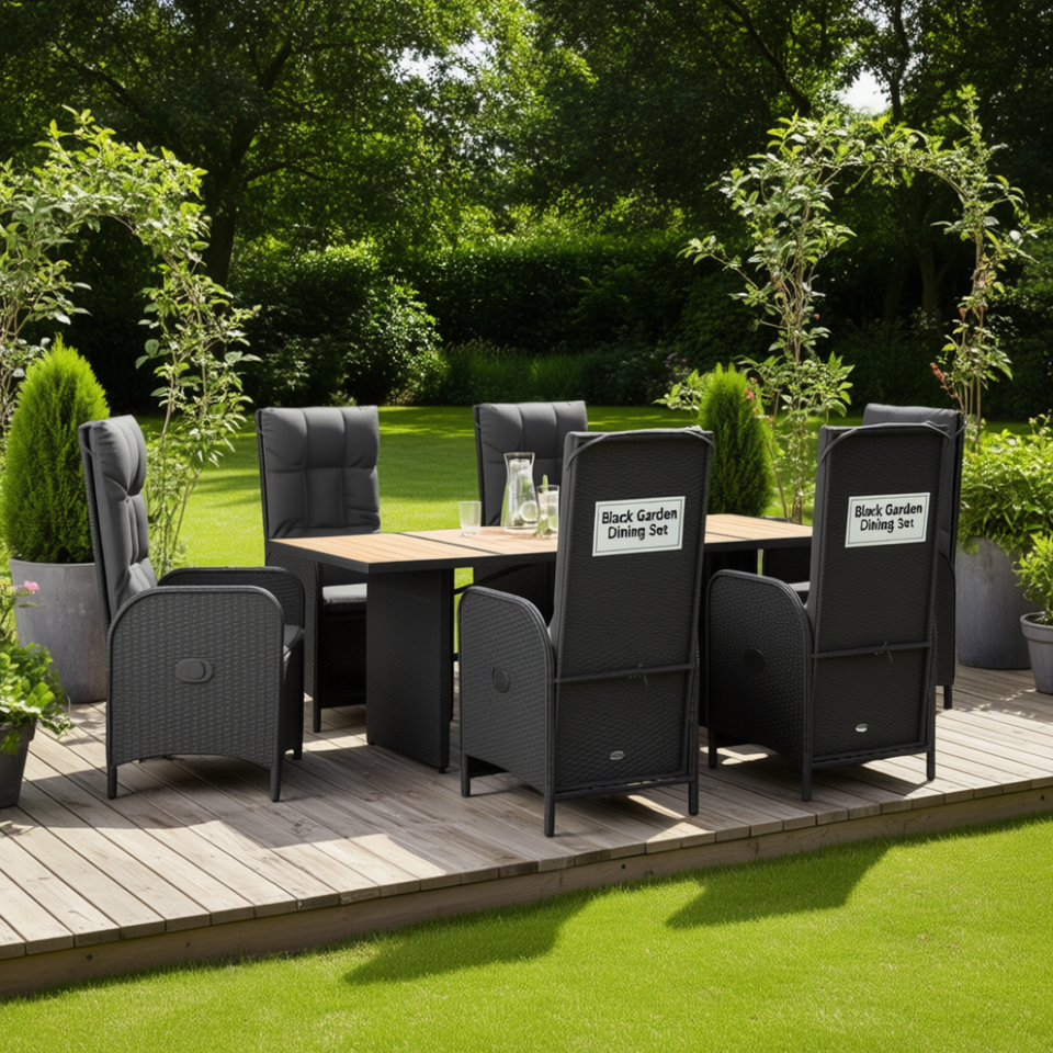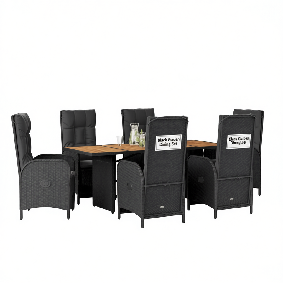 Ensemble de salle à manger de jardin noir 6 places en rotin, mobilier d'extérieur résistant aux intempéries, design contemporain