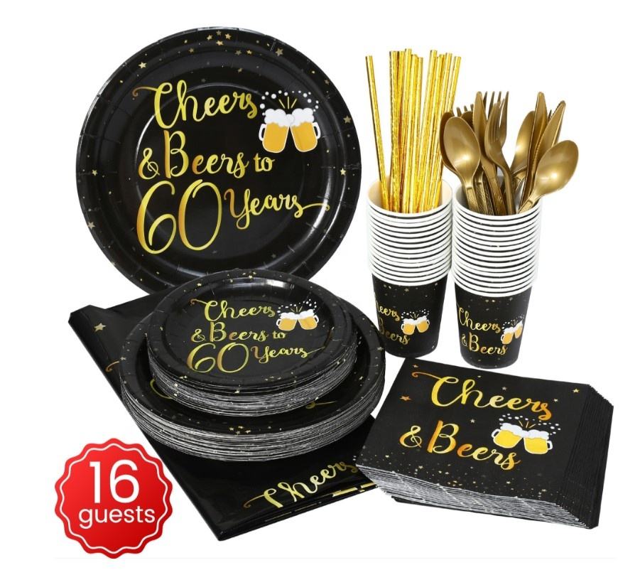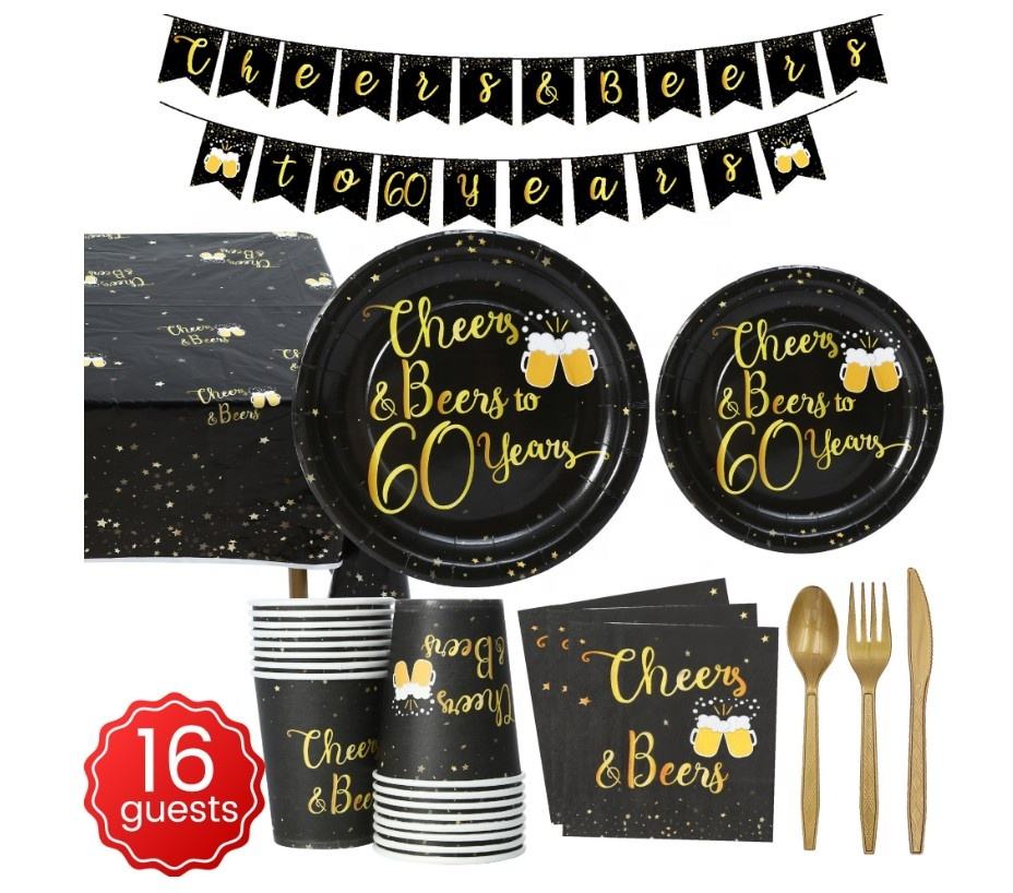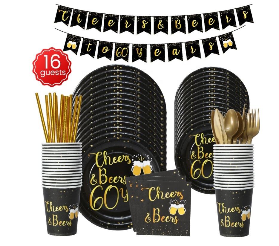 Black Gold Paper 60th Decor Happy Birthday Party Decoration Adult Disposable Party Tableware 60th Birthday Disposable Tableware