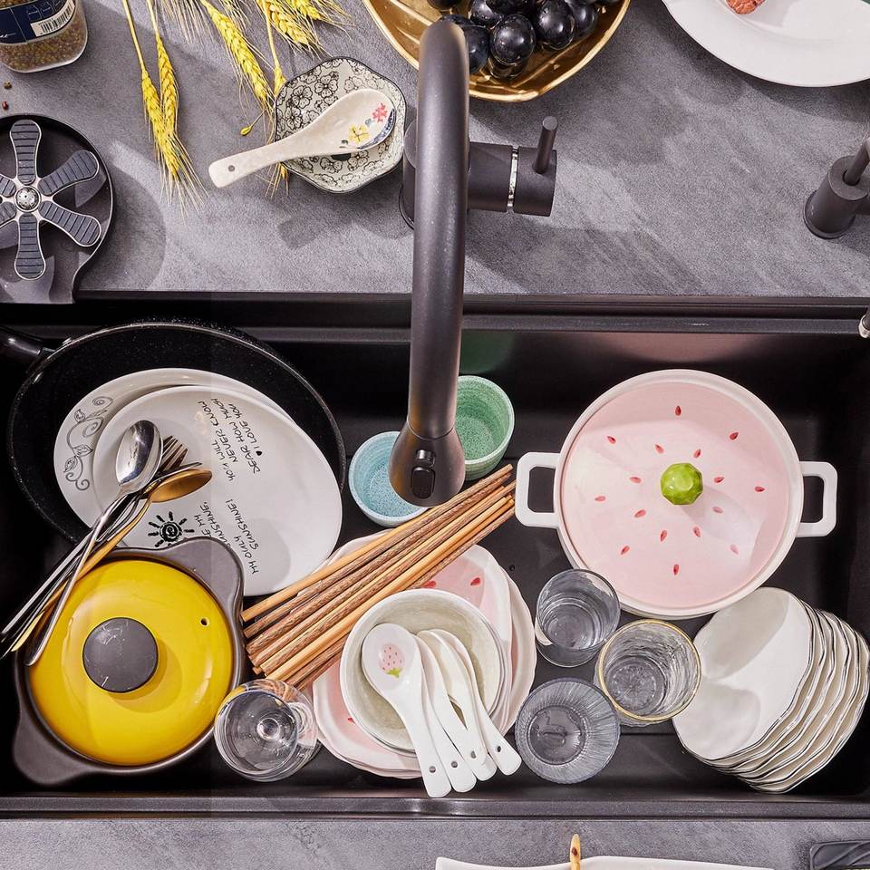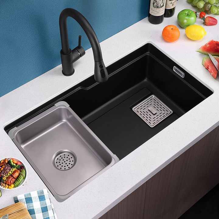 Évier de cuisine en granit noir, grand bac unique, à encastrer, épaissi, facile à nettoyer
