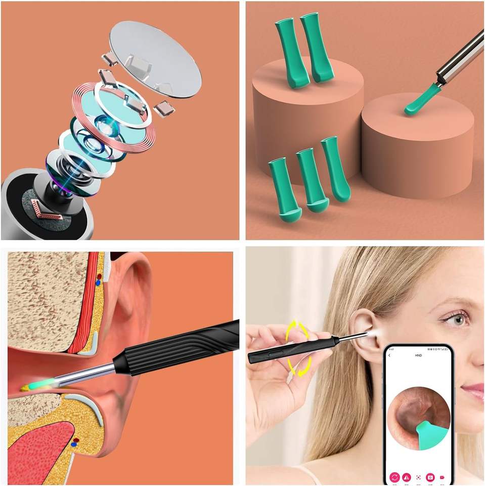 Outil d'Extraction de Cérumen Visuel Intégré Noir à Tête de Cuillère – Cure-Oreille Visuel avec Caméra Otoscope