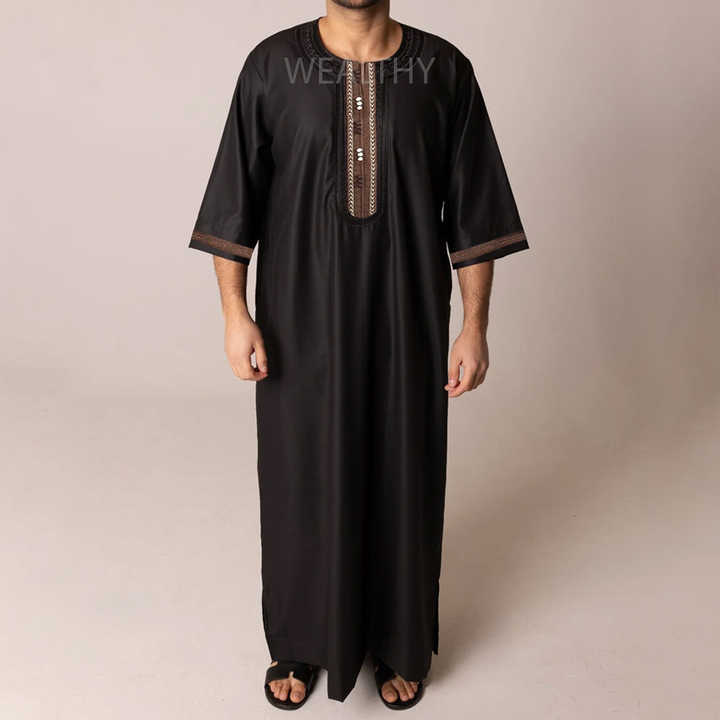 Black Islamic Jubba Men Casual Long Sleeve Silver Embroidery Dubai Style Thobe Dishdasha Ramadan Prayer Wear Kaftan Polyester