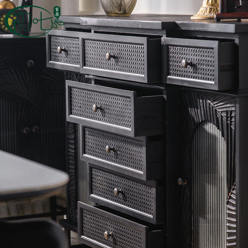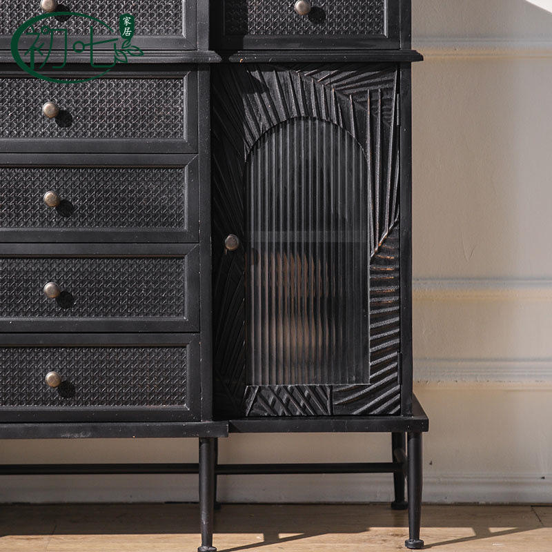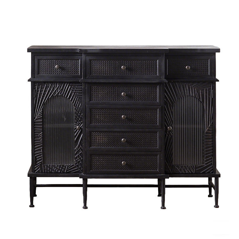 Buffet de style italien noir en bois massif avec tissage en rotin, armoire vintage pour salon, chambre et salle à manger