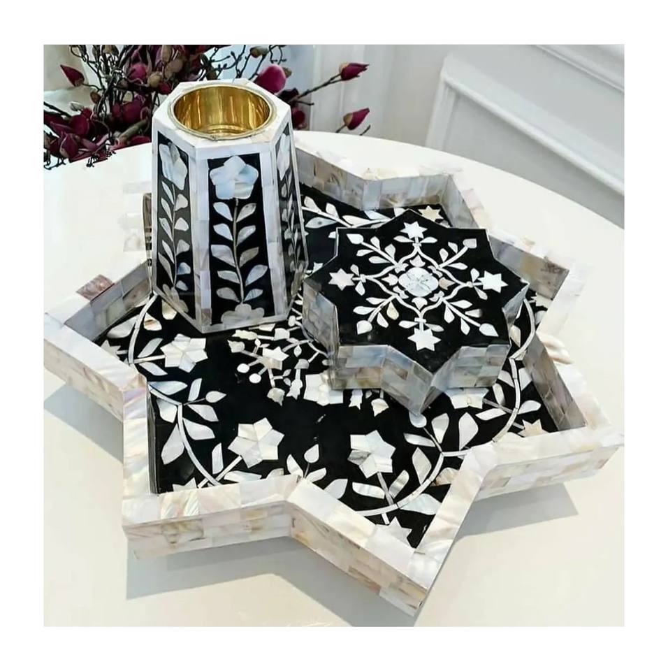 Ensemble de brûleur à encens Mabkhara Bakhoor en nacre d'ivoire noir avec incrustations de coquillages, plateau, boîte, vente en gros, personnalisation acceptée