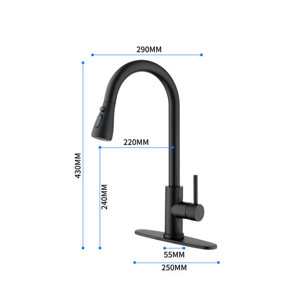Robinet de cuisine noir en acier inoxydable avec douchette extractible, monotrou, à poser sur comptoir, usage commercial, design minimaliste