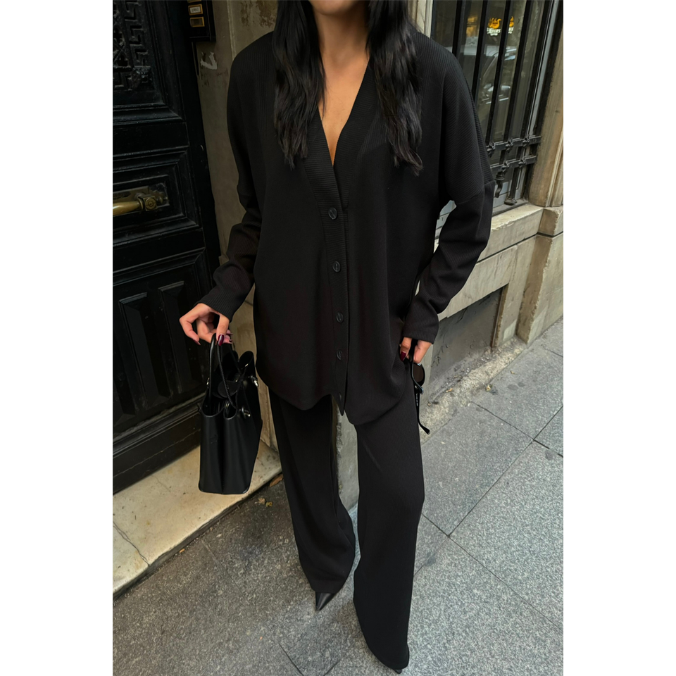 Ensemble cardigan et pantalon en tricot noir pour femmes, longueur au-dessus du genou, style décontracté, ensemble deux pièces avec décoration logo