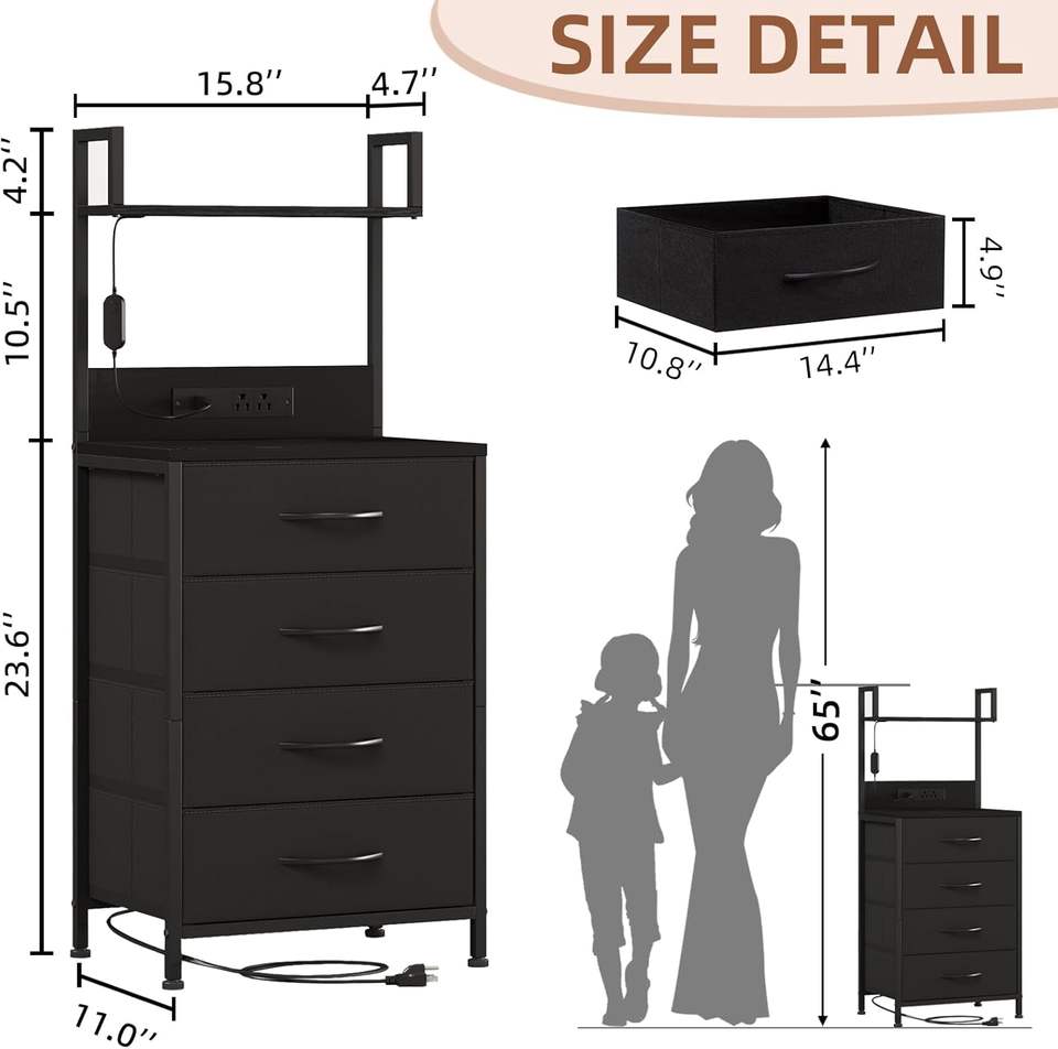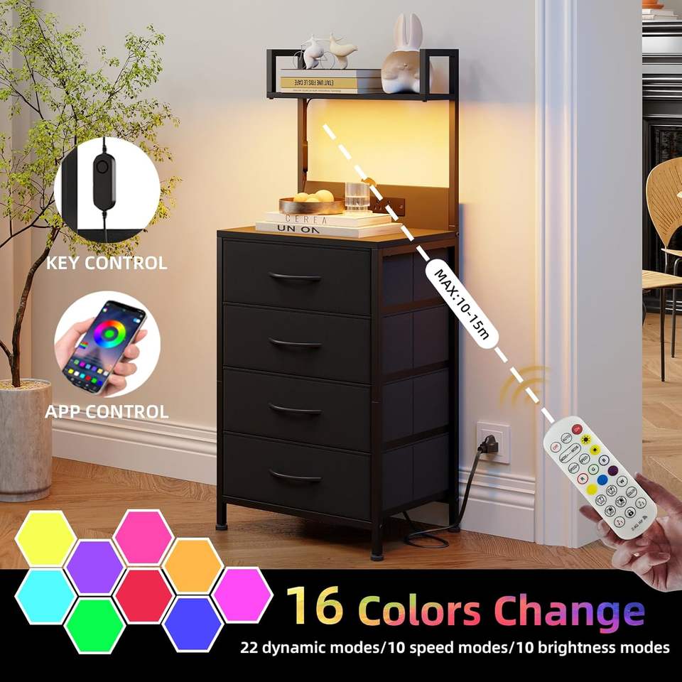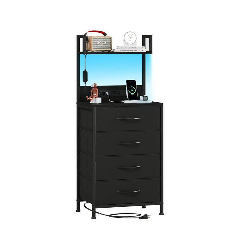 Table de chevet à lumière LED noire 4 tiroirs en tissu Table de nuit haute pour chambre d'amis dortoir couloir-Accent pour usage hospitalier