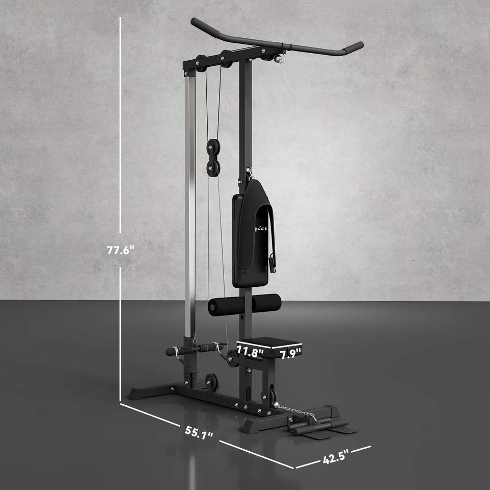 Machine de tirage vertical (Lat Pull Down) noire pour systèmes de musculation à domicile, avec poulie haute/basse, siège réglable et repose-pieds rabattable