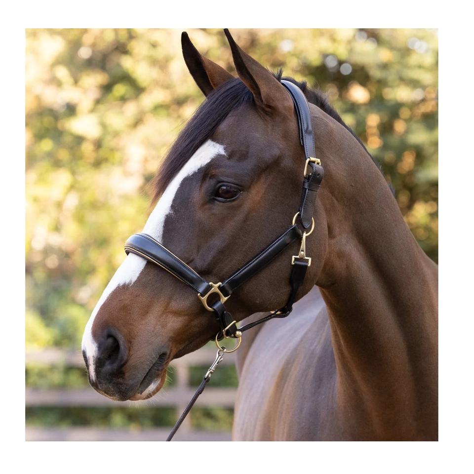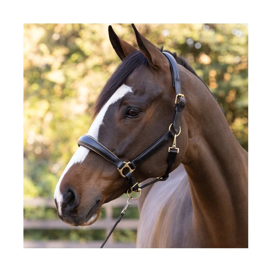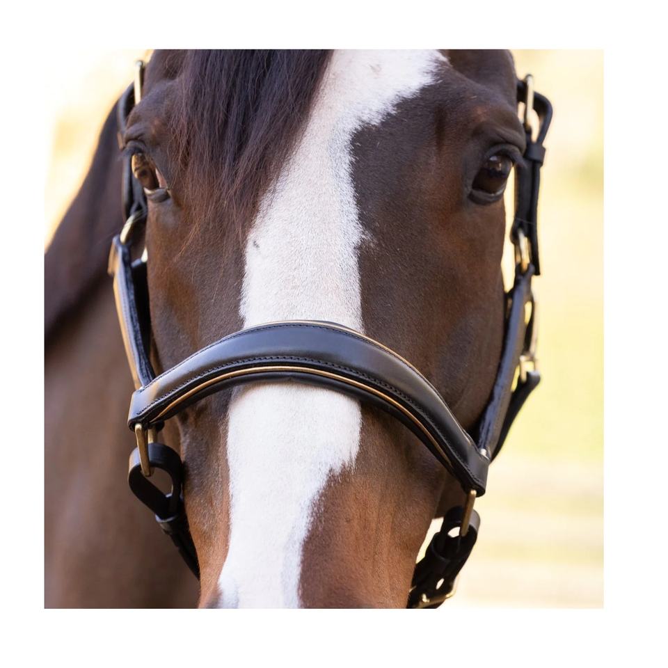 Licol rembourré conique en cuir noir avec raccord en laiton doré Patine de course de chevaux Passepoil doré métallique