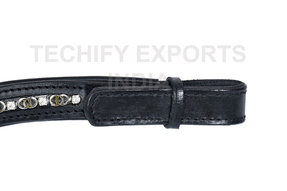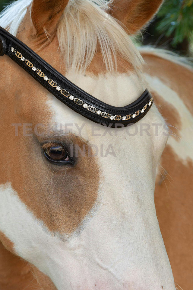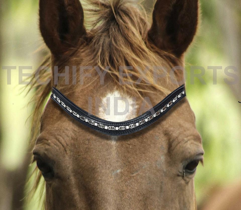 Black Leather Horse Brow band Curved Bridle Accessory with Silver Crystal Chain Decoration