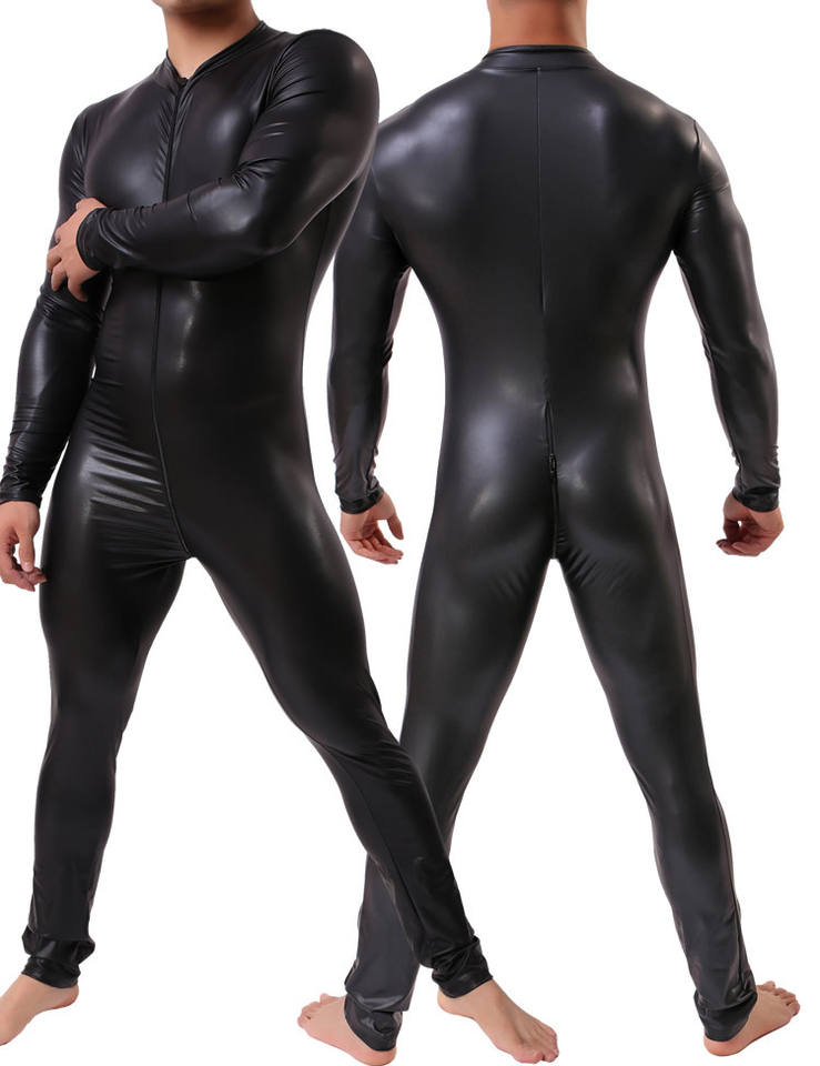 Combinaison Cosplay en cuir noir avec fermeture éclair pour homme, body une pièce